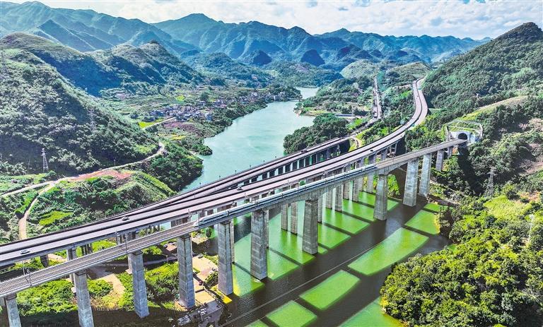 A China-Laos Railway Freight Train Crossing the Yuanjiang Double-Track Bridge