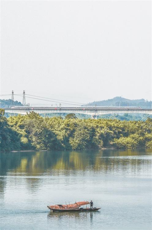 The Liujiang Double-Track Grand Bridge stands gracefully above the shimmering waves, as a Fuxing EMU train, like a silver whale, glides swiftly across the river surface.