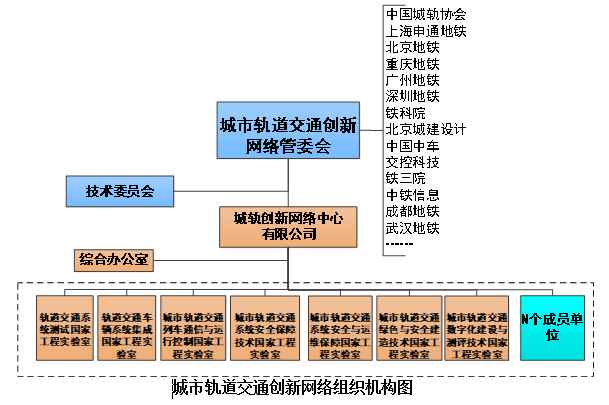 城市轨道交通创新网络由管理委员会、技术委员会、创新网络中心及成员单位构成,实行管理委员会领导下的城轨创新网络中心主任负责制。管理委员会由中国城市轨道交通协会牵头组建,是城市轨道交通创新网络的决策机构;技术委员会由城市轨道交通领域专家组成,主要为城市轨道交通创新网络技术发展方向、承担重大任务等提供咨询;城轨创新网络中心有限公司主要负责贯彻落实管理委员会的重大决策。
