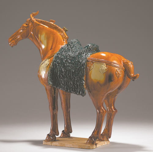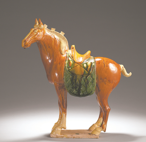 ——唐三彩障泥两鬃马,现收藏于陕西唐三彩艺术博物馆。该文物是唐代三彩马中的写实佳作,整体以西域良马为蓝本,马头侧转,双目炯炯,四肢强健有力,尽显矫健彪悍的体态。腹侧垂挂规整障泥,具有遮挡泥土的实用功能。这件文物不仅是唐代养马业兴盛、马饰文化繁荣的实物佐证,更折射出长安作为丝路枢纽的文化交融特质。其写实的风格,为研究唐代陶器、服饰制度及中外文化交流,提供了珍贵的实物资料。