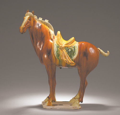 ——唐三彩腾空马,现收藏于西安博物院。该文物于1966年在西安市西郊制药厂的唐墓出土,通高38厘米、长52厘米。作为西安博物院的镇馆之宝,唐三彩腾空马四蹄腾空飞奔,马背上坐着一个胡人少年,面带微笑,双臂前伸正在驾驭奔马。马身上有红赭、黄色釉,骑手的衣服是蓝色的,色彩绚丽,釉色光亮,具有强烈的艺术感染力,是唐三彩器中的精品。