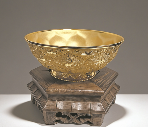 ——唐·鸳鸯莲瓣纹金碗,唐代金器,现收藏于陕西历史博物馆,也是该馆的镇馆之宝。碗内莲心、外壁莲花瓣图案,宛若一朵盛开的金莲花。莲瓣分上下两层,每一层10个莲瓣。上层装饰有动物图案,动物或奔走伫立,或衔弄花草、梳理羽毛,动静结合,栩栩如生。金碗形态庄重大方,纹饰纷繁瑰丽,图案元素贯通中西,是大唐盛世的缩影。