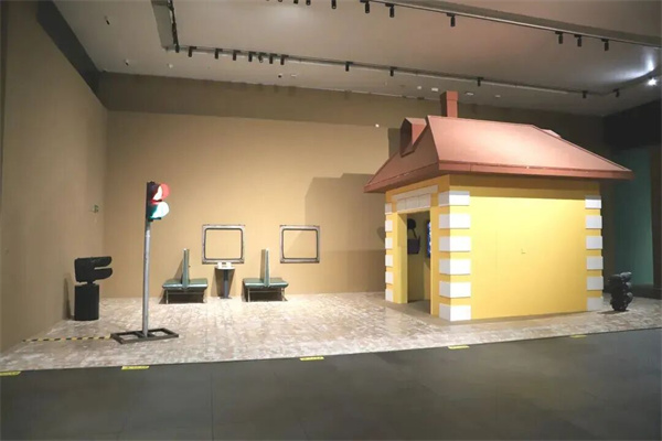 展厅中,一件名为《站台》的大型装置作品尤为引人注目。作品以东北地区火车扳道房为原型,浅红褐色屋顶与赭石色墙体复刻了工业记忆,地面如白雪覆盖,搭配绿皮火车座椅、茶几与模拟车窗,再辅以信号灯的光影点缀,让每一位观众都能成为这段旅途中的风景,完美诠释了“场域性景观”的艺术构想。