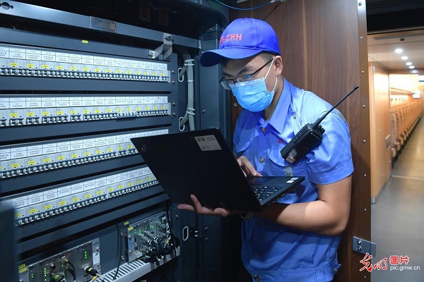 2021年10月5日凌晨,北京朝阳动车所职工对入库列车实时精准“体检”,确保节日运输安全。(孙立君摄/光明图片)
