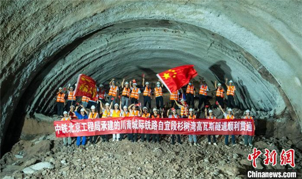 中新网富顺10月4日电 (记者 刘忠俊)10月4日,四川自贡至宜宾高铁控制性工程、全线唯一高瓦斯隧道杉树湾隧道贯通,隧道贯通为全线建成通车奠定了坚实基础。