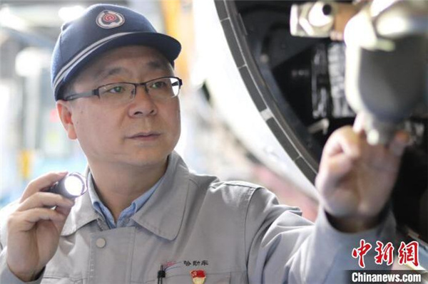 冷宏军在检查动车组 李畅 摄