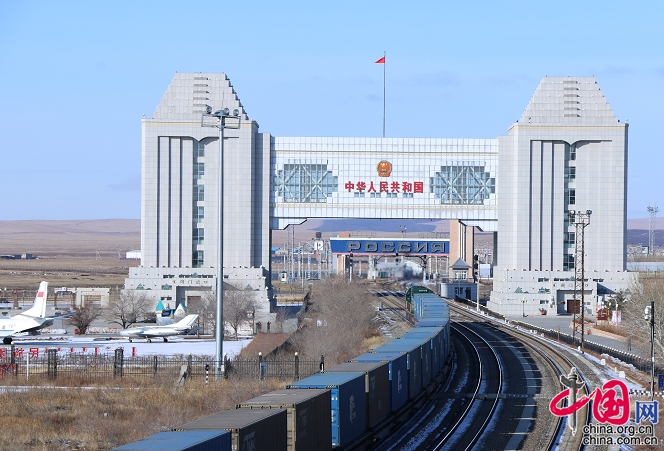 为满洲里铁路口岸站,一列中欧班列从国门通过。果乃伦摄