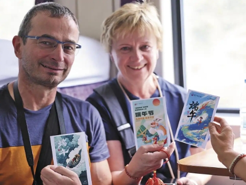 来自德国的夫妇收到乘务员自制的端午贺卡和香包后兴奋地说:“没想到在火车上还能体验中国传统节日,这次旅行让我们难忘!”