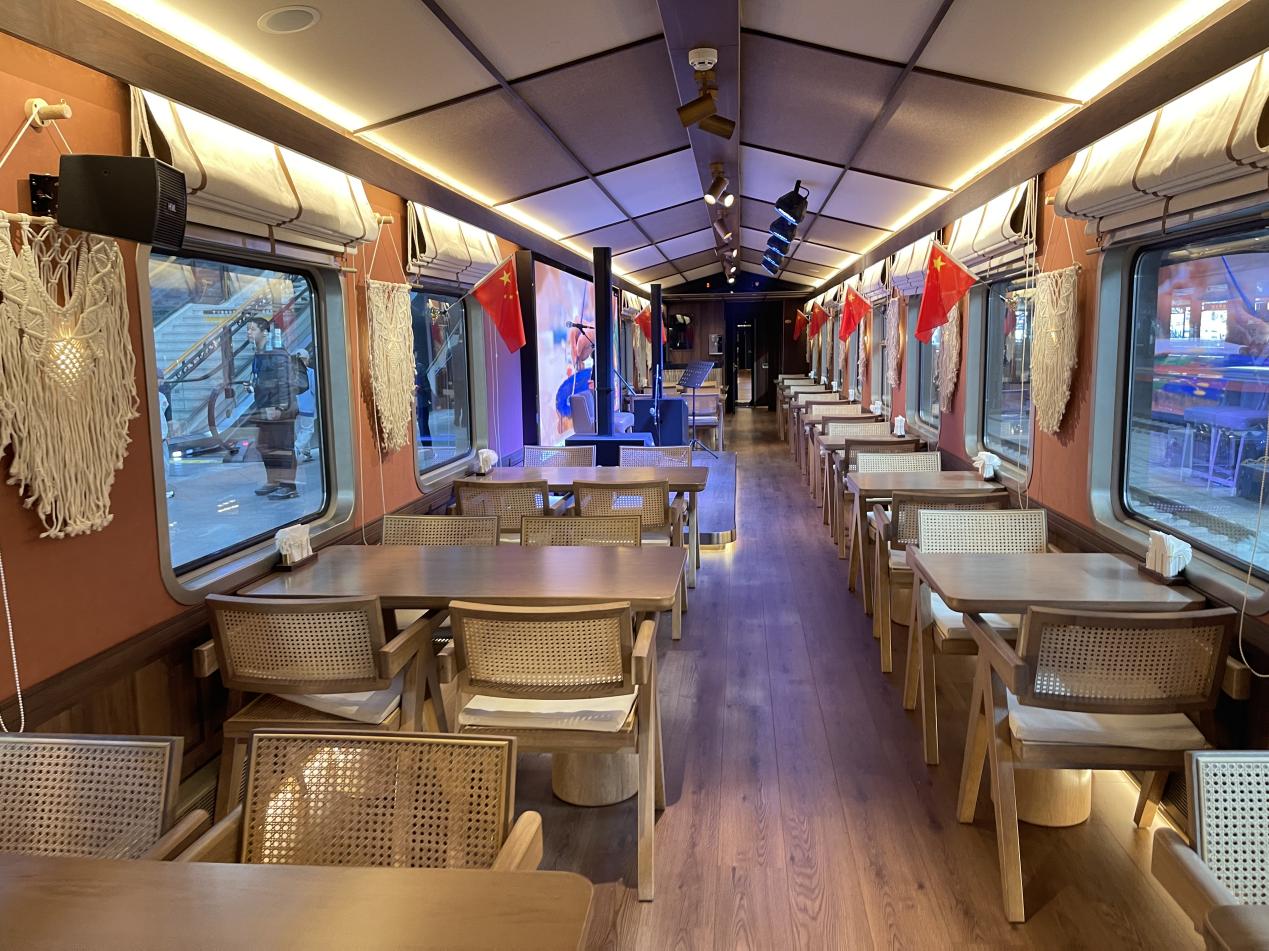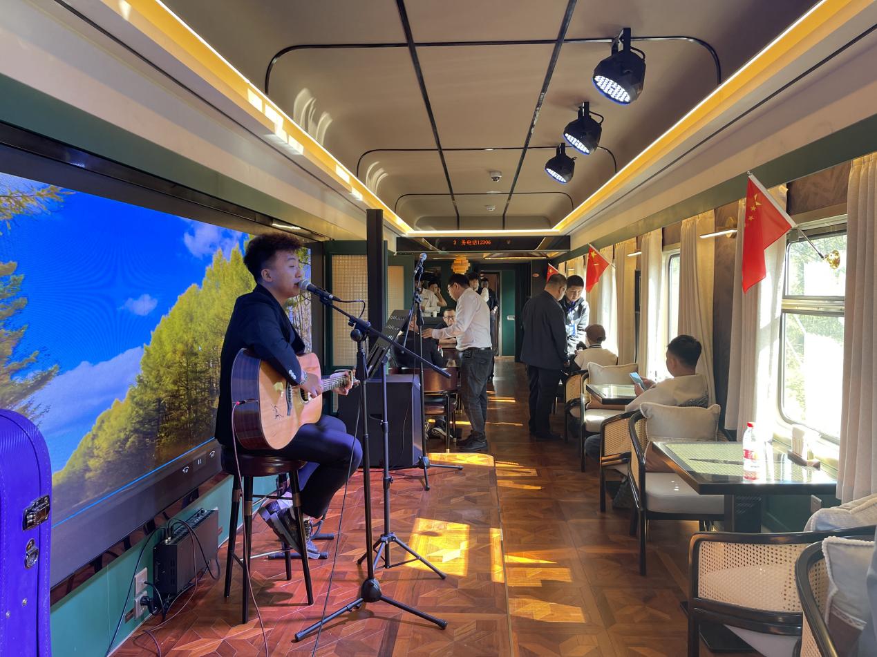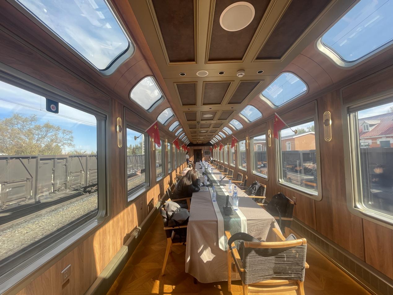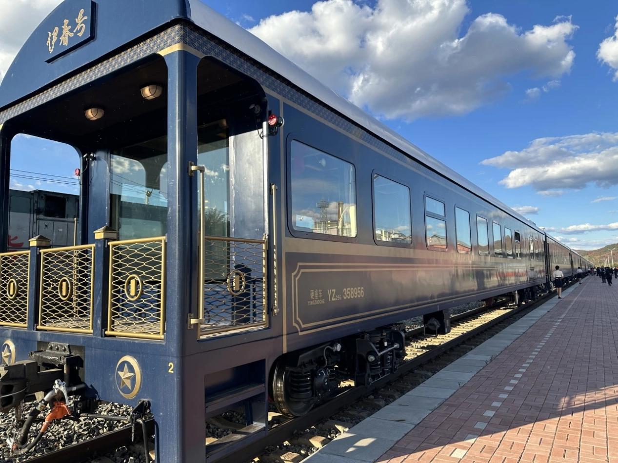10月1日上午,哈尔滨站14站台国旗飘扬、花团锦簇,在《伊人之春》、《我在黑龙江等你》等悦耳的音乐声中,“伊春号”旅游列车首发仪式成功举行,来自全国各地以及新加坡、泰国、台湾等地的200余名中外游客齐聚冰城,开启了“游千里画廊,赏最美五花山”浪漫之旅。“伊春号”极具特色,外观为轻奢复古风格,车身主体颜色为深海蓝和珍珠金,车顶的白色突出亚冬会冰雪主题,无论是行进在“绿水青山”,还是“冰天雪地”间,都极具辨识度。列车整列编组11辆,最大亮点是其观光车的设计,其中有5辆休闲娱乐观光车是根据“行走的敖麓古雅”“红堡之夜”“金海岸漫步”“撒哈拉故事”“浪漫的温哥华”五个大洲文化特色和建筑风格设计;有2辆多功能观光车首创全景式观光车厢和怀旧式旅拍车尾,视野极为开阔,给游客们带来全新的观景体验。
