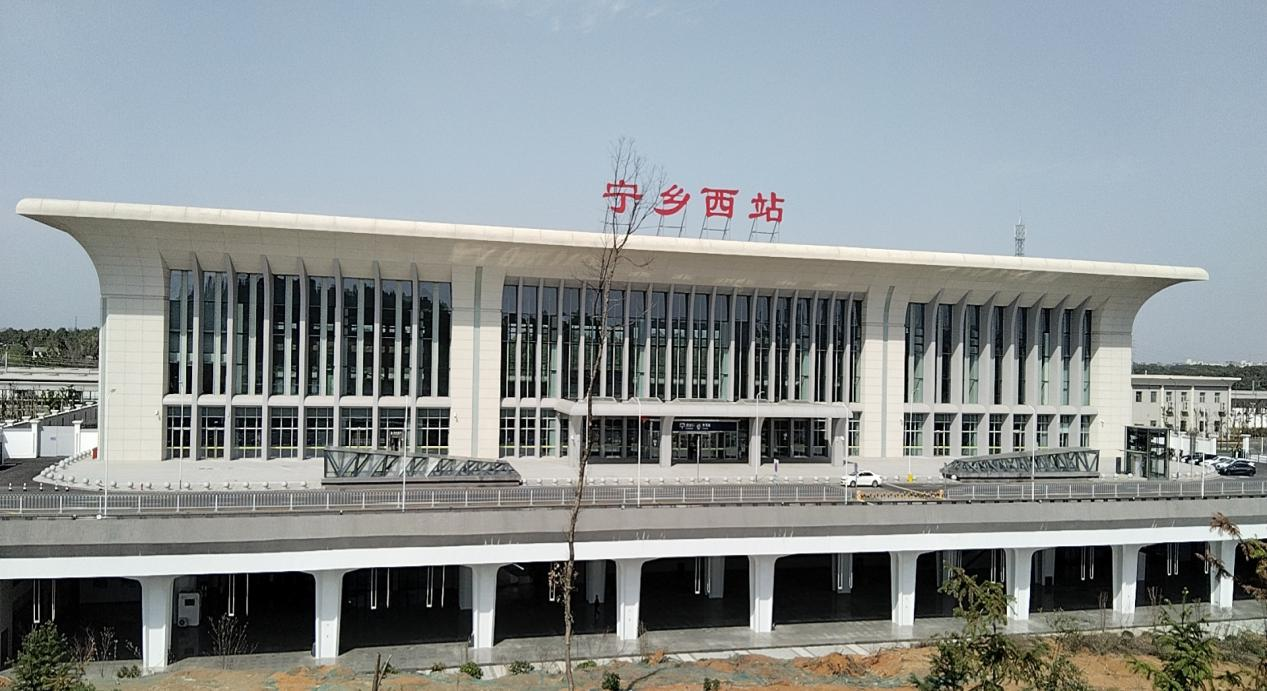 宁乡西站站房立面造型以“青铜文化”为设计理念,以青铜鼎身传统梯形形态为基础,通过形态演变,用线条的形式构建建筑立面意向,以倒梯形作为鼎的主体形态,端庄典雅,雄浑庄重,体现出了浓郁的地方文化和典雅的东方纹饰艺术特点。宁乡西站站房总建筑面积为9990平方米,候车面积4644平方米,设有进出站地道各一座。